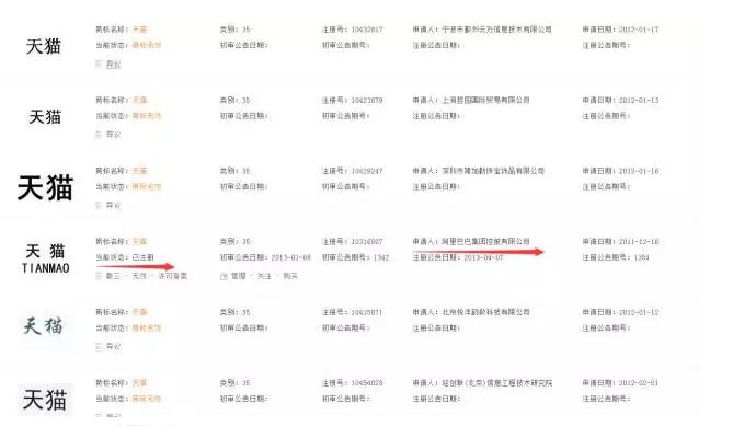 例如:“天猫”第35类广告销售商标,共有50件申请,只有阿里巴巴公司等的5件商标已注册,1件驳回复审,44件已被无效成“炮灰”。